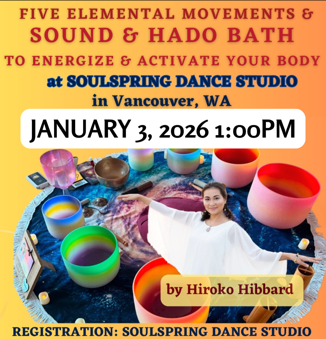 Flow through the wisdom of the Five Elements — Earth, Water, Wood, Fire, and Air — in this soulful blend of movement, breath, and sound. Guided by dance-like movements representing each element by Hiroko, Hado Healing & Feng Shui practitioner, you’ll explore how each element moves through your body: Grounding into the Earth, Flowing like Water, Growing like Wood, Igniting your Fire, and Expanding with Air.